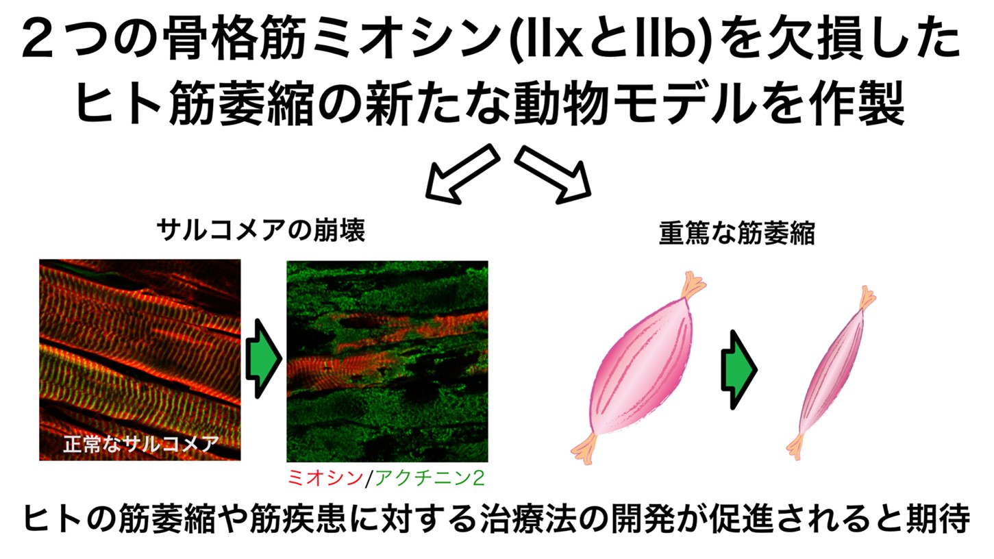 ヒトを含む大型の哺乳動物では、MyHC-IIbの発現が元々非常に低く、MyHC-IIbはヒトの骨格筋ではほとんど機能していないと考えられています。一方、骨格筋の実験モデルとして用いられるマウスでは、ヒトと異なりMyHC-IIbが多くの筋組織で利用されています。そこで研究グループは、ヒトの骨格筋での筋ミオシンタンパク質の機能を知るためには、MyHC-IIbの機能が欠失したヒト骨格筋の状態を模倣する必要があると考えました。研究グループは、ヒトの骨格筋でMyHC-IIxに機能異常が生じたケースを想定して、MyHC-IIxとMyHC-IIbが同時に機能しなくなった、2つの筋ミオシンのダブルノックアウト(dKO)マウスを作製しました。