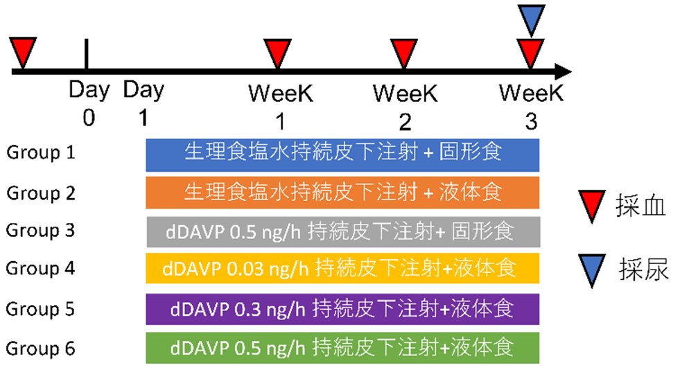 8週齢の雄C57BL/6マウスに液体食投与とデスモプレシン酢酸塩水和物(dDAVP)の持続皮下注を行いました。dDAVPの用量は0.03ng/h(dDAVP0.03+液体食群)、0.3ng/h(dDAVP0.3+液体食群)、0.5ng/h(dDAVP0.5+液体食群)としました。また、比較として、生理食塩水持続皮下注と固形食を投与した群(生食+固形食群)、生理食塩水持続皮下注と液体食投与群(生食+液体食群)、dDAVP0.5ng/h持続皮下注と固形食投与群(dDAVP0.5+固形食群)を作製しました(図1)。また、dDAVP0.03+液体食群をコントロール群、dDAVP0.3+液体食群を低Na血症群として、恐怖条件付けテスト、T字型迷路による記憶の評価を行いました。
