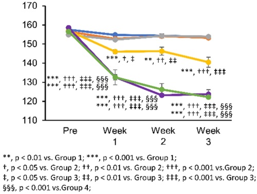 dDAVP投与3週間後、6群間で体重の有意差を認めませんでした。血清Na値は生食+液体食群(153.3±0.3 mEq/L)と比較して、dDAVP0.03+液体食群(140.5±2.7 mEq/L)では有意に低下し、dDAVP0.3+液体食群(123.7±2.4 mEq/L)、dDAVP0.5+液体食群(122.2 ±0.5 mEq/L)ではさらに低下していました(図2)。また、血清尿酸値は、生食+液体食群と比較して、dDAVP0.3+液体食群、dDAVP0.5+液体食群で有意に低下していました。さらに、尿浸透圧は、生食+液体食群と比較して、dDAVP0.3+液体食群、dDAVP0.5+液体食群で有意に上昇していました。行動解析では、低Na血症群で記憶の低下を認め(図3)、慢性Na血症を補正することにより、完全ではないものの、記憶の改善を認めました(図4)。