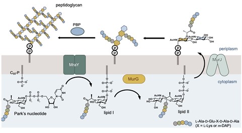 細菌の抗菌薬耐性(AMR)は、人類の健康に深刻な脅威を与えています。近年の推定では、2019年には世界中で495万人がAMRに関連して死亡し、そのうち127万人がAMRに起因するとされています。AMRに対処するためには、新たな作用機序を持つ新規抗菌薬の開発が急務とされています。新しい抗菌薬の開発にはターゲットの選択が重要です。細菌の細胞壁であるペプチドグリカンの生合成は(p1図)、抗生物質を開発する上で良いターゲットとして知られ、これまでにペニシリンなどの-ラクタム系抗生物質やバンコマイシン等が開発されてきました。近年では、ペプチドグリカンの前駆体であるリピド I を合成する酵素MraY(すべての細菌の生育に必須な酵素)が、抗生物質開発の新たなターゲットとして期待されています。