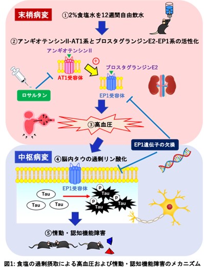 食塩の過剰摂取は、高血圧や認知機能障害に密接に関与していることから認知症のリスク因子として考えられています。しかしながら、高血圧と認知症の関連性の基盤となるメカニズムは分かっておらず、末梢と中枢の相互作用(末梢-中枢連関※1)に注目した検討は十分にされていませんでした。同研究グループはアンギオテンシンII-AT1系※2とプロスタグランジンE2-EP1系※3のクロストークを介する高血圧が、アルツハイマー型認知症の病態に関連するタウ※4の過剰リン酸化を伴う情動・認知機能障害を引き起こすことを明らかにしました。