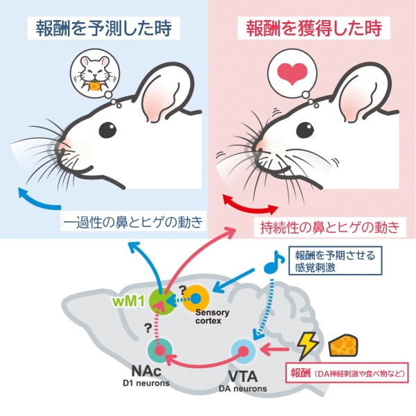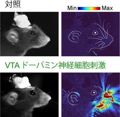 - 脳の報酬情報処理に関わる中脳ドーパミン神経細胞*1を活性化すると、マウスの顔運動が生じることを世界で初めて発見しました