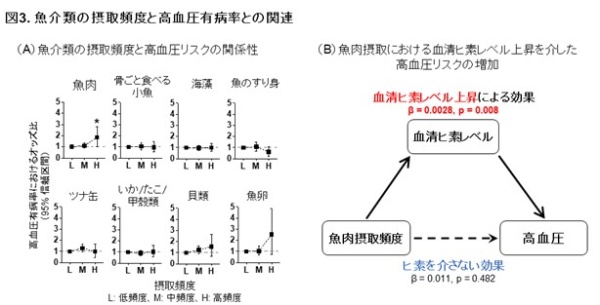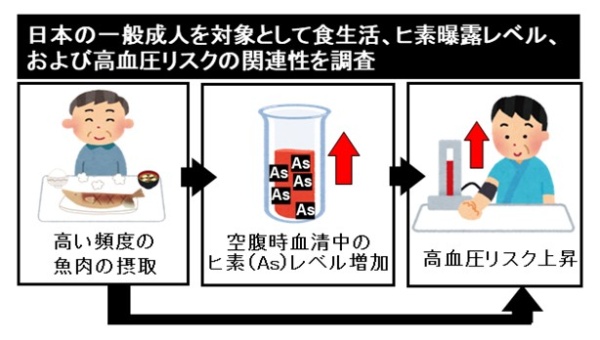これらの結果より、血清中のヒ素濃度の増加が高血圧のリスク因子となることが示され、さらに、高い頻度で魚肉を摂取することが血液中のヒ素濃度の増加に潜在的に関与していることが示唆されました。