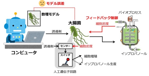 生産物の収量を最大化するために、コンピュータは数理モデルを使って最適な大腸菌のふるまいを計画し、誘導剤を使って大腸菌に伝える。大腸菌は、モデル誤差による計画の乱れを、人工遺伝子回路によるフィードバック制御により補正する。
