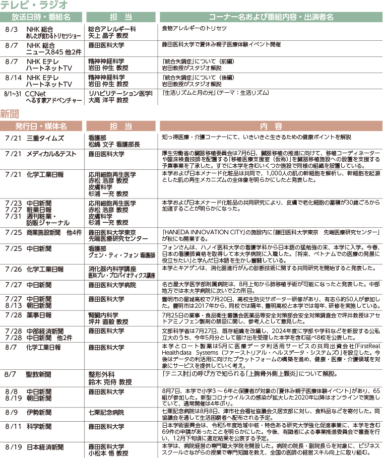 本学園の取り組みや研究・医療ニュース等に関する記事の掲載、教職員のTV出演情報です。
