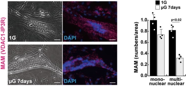 - 微小重力下での筋萎縮を防ぐために、ミトコンドリア・小胞体接着点(MAM)の適切な維持が重要であることが本研究で明らかとなりました。