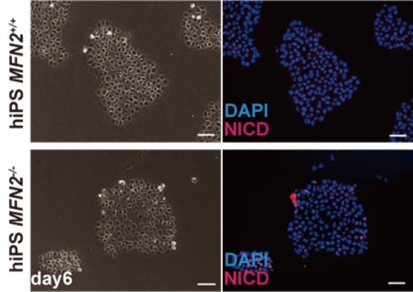 図2 MFN2欠損ヒトiPS細胞中でのNICD(Notch細胞内ドメイン)発現の上昇(図下赤)