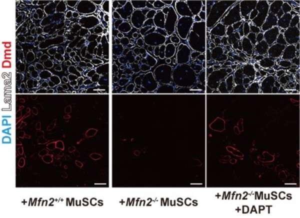 図3 ジストロフィン(DMD)欠損の再生筋中に移植したMFN2欠損筋幹細胞による筋再生への寄与の差(左:野生型筋幹細胞移植、中央:MFN2欠損筋幹細胞移植、右:MFN2欠損筋幹細胞移植後にDAPT処理、図赤色部分:移植幹細胞が発現したDMD)