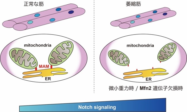 - Notchシグナル経路の抑制効果のあるガンマセクレターゼ阻害剤の投与により、微小重力下での萎縮筋やマウスにおけるMfn2欠損筋幹細胞の再生能力が改善されたことからMAMとNotchシグナルの調節が、筋萎縮再生に重要な役割を果たすことが示されました。