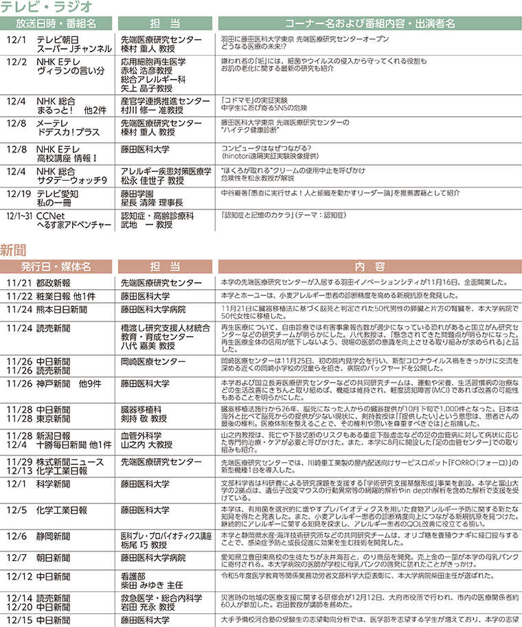 本学園の取り組みや研究・医療ニュース等に関する記事の掲載、教職員のTV出演情報です。