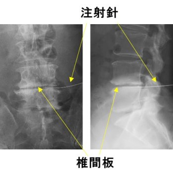 椎間板へのPRP注射時のレントゲン像。左:正面、右:側面