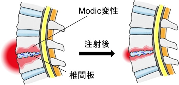 - Modic (モディック)変性を伴う腰痛患者さん10名の椎間板に、患者さん自身の多血小板血漿(PRP)を注入したところ、半年の経過観察期間では大きな有害事象はなく、個人差はあるものの、全体として腰痛は緩和された。