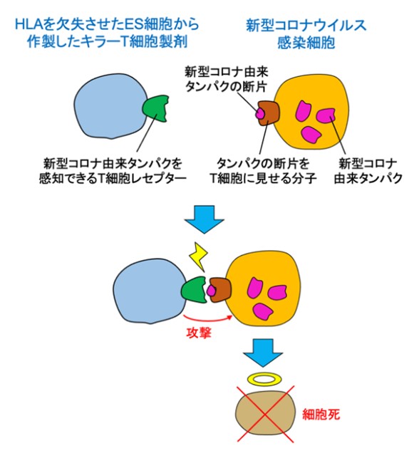 キラーT細胞は、T細胞レセプター(TCR)という分子を使って、ウイルス感染細胞を見つけ出して殺傷します。藤田医科大学の河本研究室と大阪大学の山崎晶研究室は、新型コロナウイルスに感染したことを感知するT細胞レセプターを複数個同定しました。一方で京都大学の河本研究室は、国立成育医療研究センターのES細胞を材料にして、まず拒絶されにくくするためにHLAを欠失させ、その後NY-ESO1抗原特異的TCRを導入し、そのES細胞からキラーT細胞を作製しました。そのキラーT細胞に新型コロナウイルス感染を感知できるTCR遺伝子を導入しました。そのようにして作製したキラーT細胞は、新型コロナウイルス由来の成分を細胞内に出している標的細胞を殺傷することができました。