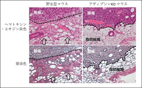 これらの成果を踏まえ移植実験をしたところ、アディプシン遺伝子を欠損するノックアウト(KO)マウスでは、乳がんに接する乳腺脂肪組織へのがん細胞浸潤や炎症反応、腫瘍被膜形成が野生型マウスに比べ明らかに抑制されるとともに(図3)、肺への乳がん転移を起こすマウスの数も減少した。その分子機構を解明するために腫瘍組織の遺伝子発現解析や、脂肪細胞とがん細胞の共培養実験を行ったところ、アディプシンを発現する成熟脂肪細胞は、がんの移動、浸潤、転移を促進するマトリックスメタロプロテアーゼ9やガレクチン7のがん細胞での発現を誘導することが分かった(図2)。