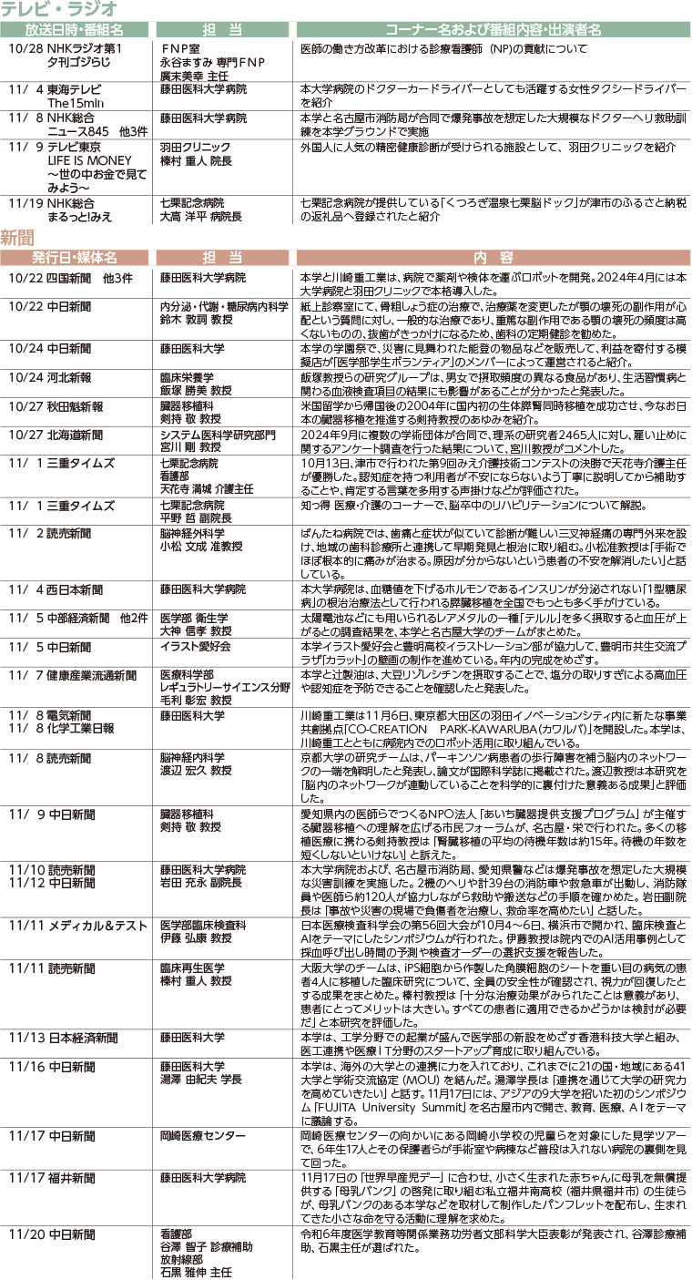 本学園の取り組みや研究・医療ニュース等に関する記事の掲載、教職員のTV出演情報です。