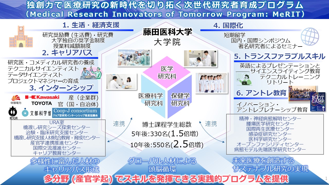 今回、採択された本学の提案「独創力で医療研究の新時代を切り拓く次世代研究者育成プログラム(MeRIT)」は、多分野(産官学起) でスキルを発揮できる人材の育成を目的に、下記6つの実践的プログラムで構成しています。