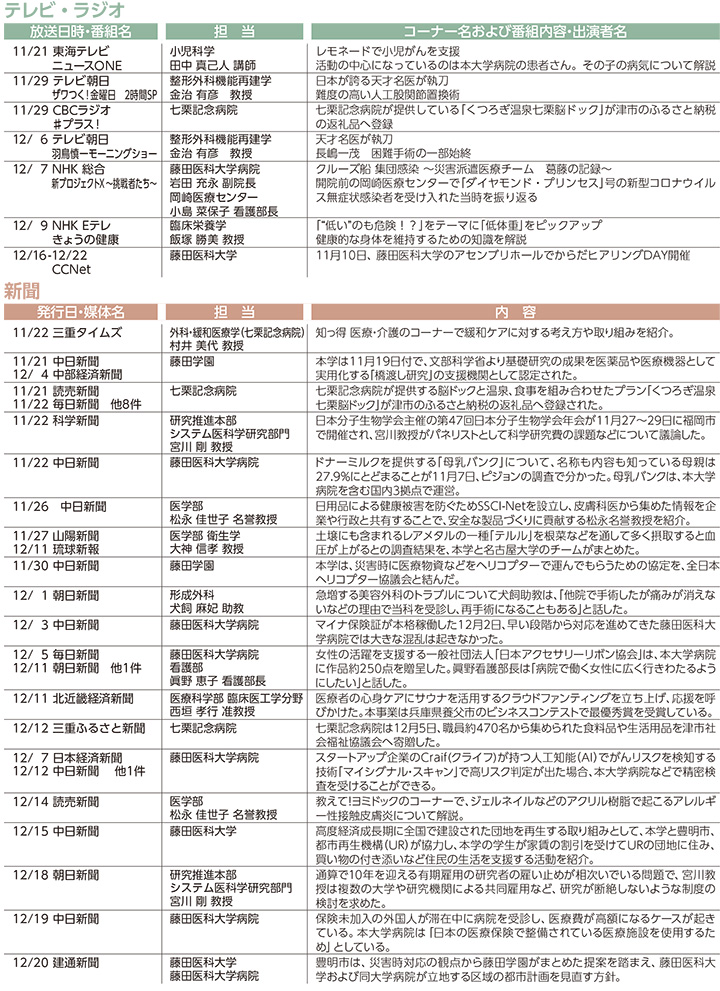 本学園の取り組みや研究・医療ニュース等に関する記事の掲載、教職員のTV出演情報です。