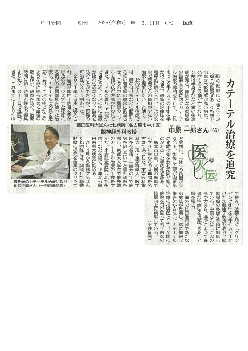 本学 ばんたね病院 中原一郎教授の最先端のカテーテル治療に関する記事が2025年3月11日中日新聞(朝刊)医人伝に掲載されました