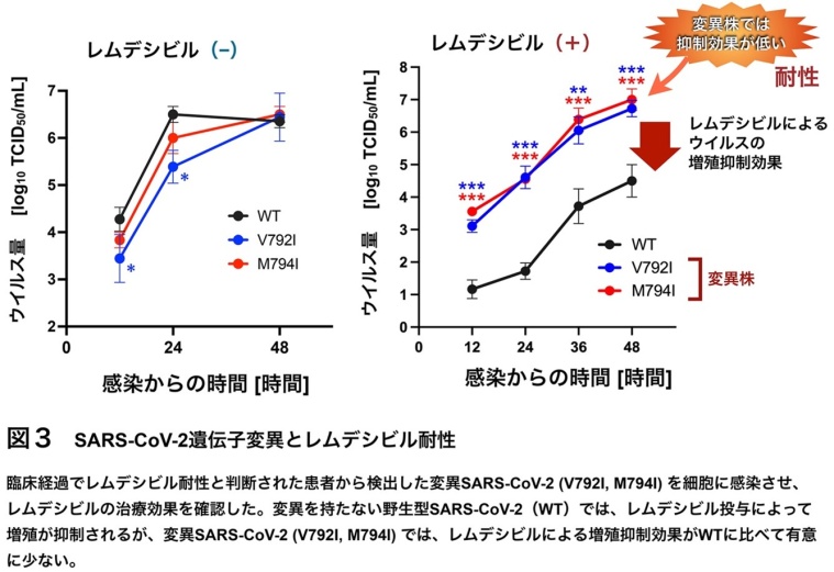 RNAポリメラーゼ(蛋白質)の元となる遺伝子の一部に変異が生じると、蛋白質の構造が変化し、レムデシビル本来の効果が発揮できなくなると推測される。薬剤が本来もつ効果が認められなくなる現象を「耐性化」と呼ぶ。