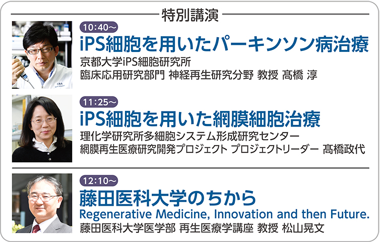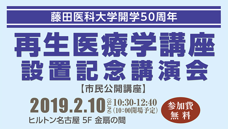 藤田医科大学は2018年4月、松山晃文教授による「再生医療学講座」を開設しました。それを記念して、京都大学・髙橋淳教授と理化学研究所・髙橋政代プロジェクトリーダーをお招きして、2019年2月10日にヒルトン名古屋で記念講演会を開催いたします。お二人は、iPS細胞を使った最先端の臨床研究で日本をリードする第一人者で、それぞれ「パーキンソン病」と「網膜細胞治療」の専門家です。また、本学の松山教授は「藤田医科大学のちから Regenerative Medicine,Innovation and then Future」を講演いたします。