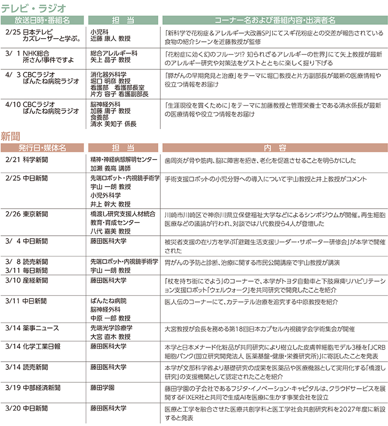 本学園の取り組みや研究・医療ニュース等に関する記事の掲載、教職員のTV出演情報です。