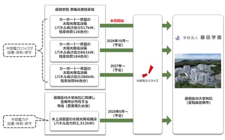 学校法人藤田学園(理事長:星長 清隆、以下「藤田学園」)および中部電力ミライズ株式会社(代表取締役:神谷 泰範、以下「中部電力ミライズ」)は、藤田学園豊明校地(藤田医科大学、藤田医科大学病院)の敷地に設置した「カーポート一体型の太陽光発電設備」が本日、運転を開始したことをお知らせします。本取り組みは、藤田学園と中部電力ミライズが「災害に強い病院」の実現に向け、2023年1月27日に豊明市(市長:小浮正典)と締結した「災害時医療継続にむけた協定書」(以下「本協定」)に基づくものです。