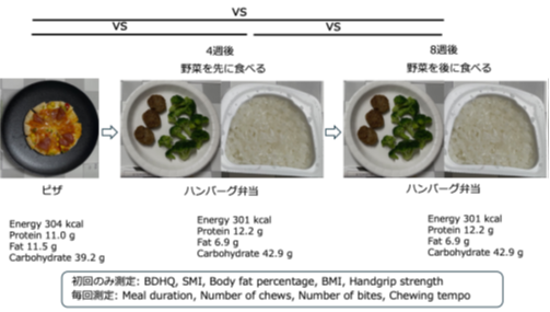 本研究では、参加者41名(男性18名、女性23名)にピザおよびハンバーグ弁当(ハンバーグ、ご飯、ブロッコリー)を4週間ごとに食べてもらい、食事時間、咀嚼回数、一口回数、咀嚼テンポを測定しました。野菜を食べる順番による食事時間への影響を検討するため、(1)ブロッコリーを最初に食べた後に他の食品を摂取する場合、(2)他の食品を食べ終えた後にブロッコリーを摂取する場合、の2通りの条件で実施しました。