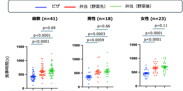 ピザと比較すると、弁当(野菜を最初または最後に食べた場合)の方が食事時間(秒)が長くなりました。ピザと弁当(野菜を最初に食べた場合)の平均差は-182秒、ピザと弁当(野菜を最後に食べた場合)の平均差は-216.0秒:詳しくは、ピザ-弁当(野菜を最初に食べた場合):-182秒[-245.6,-118.9]秒、p<0.0001;ピザ-弁当(野菜を最後に食べた場合):-216.0秒 [-273.3, -158.7]秒、 p < 0.0001)。一方、野菜の摂取順番にかかわらず、食事時間(秒)に差は認められませんでした(p = 0.14)。これらの結果は、咀嚼回数および咀嚼テンポについても、性別にかかわらず、ピザと弁当、食べる順番について同様の傾向が見られました。