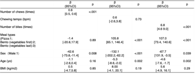 多変量解析の結果では、食事時間は、咀嚼回数、咀嚼回数、食事の種類と正の相関があり、年齢、性別とは負の相関がありました。BMIは食事時間と関連しませんでした。