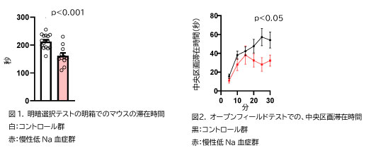- マウスモデルを用いて、慢性低Na血症により、不安様行動が増強することを発見。