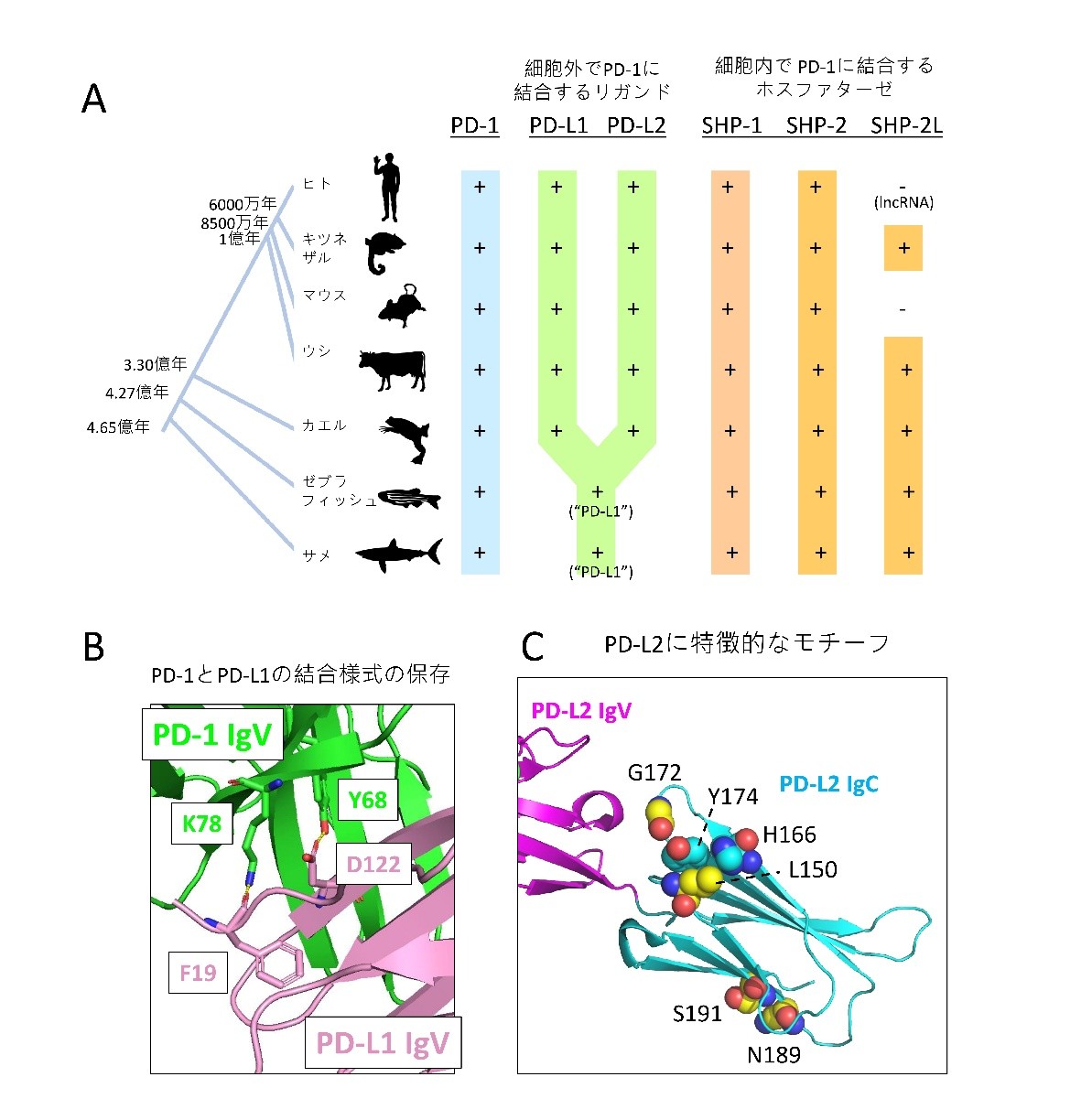 - PD-1の細胞内領域にこれまでに知られていなかった配列モチーフが保存されていること、四肢動物にしか存在しないPD-L2に未知の表面構造が存在することが明らかになった。