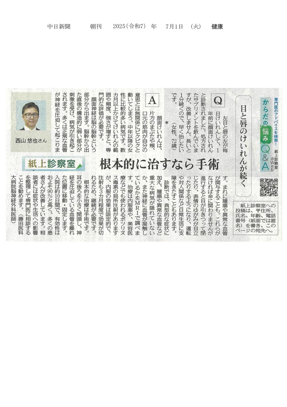 本学病院 西山悠也講師が顔面けいれんについて回答したことが2025年7月1日中日新聞(朝刊)紙上診察室に掲載されました