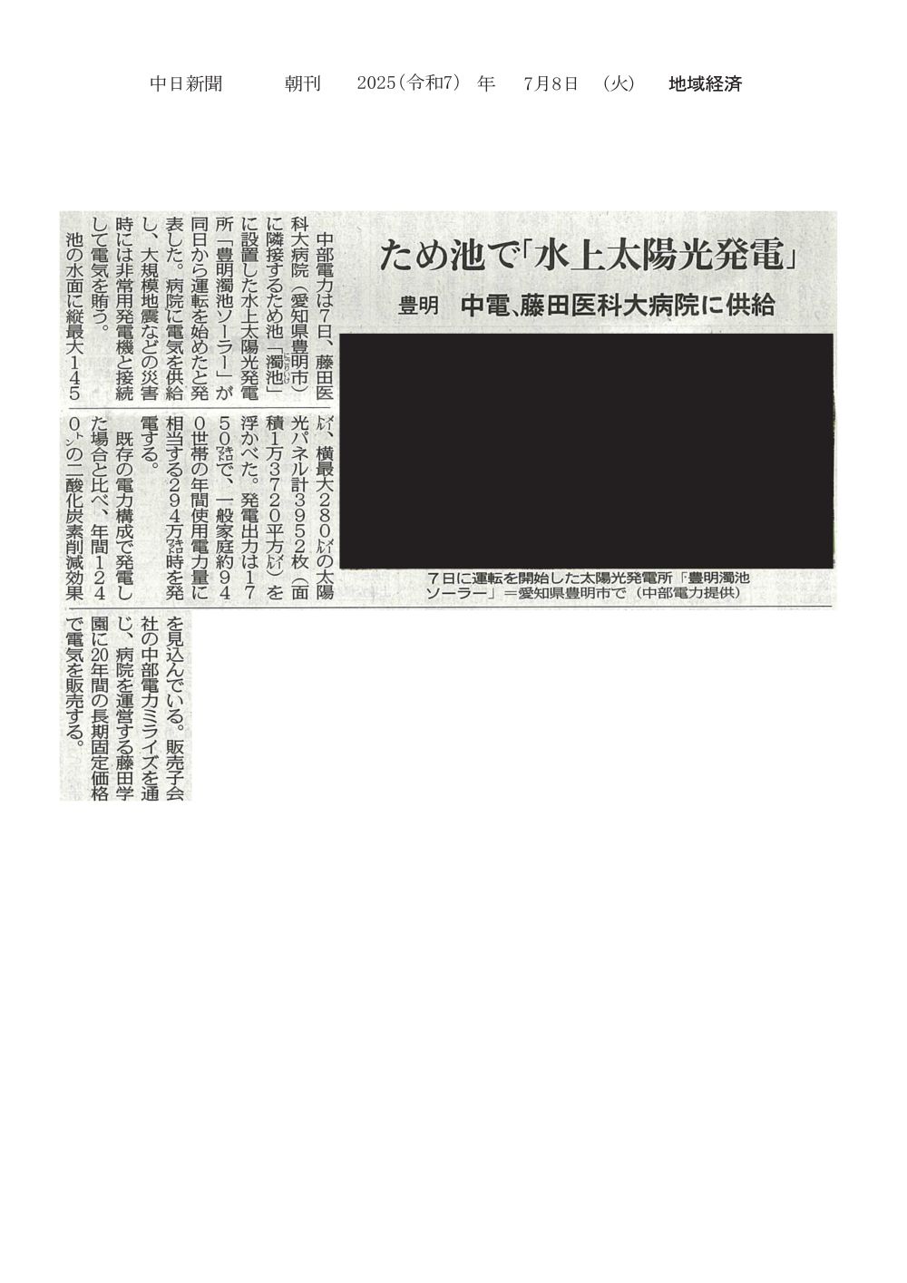 本学病院に隣接するため池に設置された水上太陽光発電所「豊明濁池ソーラー」が運転を開始したことが2025年7月8日中日新聞(朝刊)に掲載されました