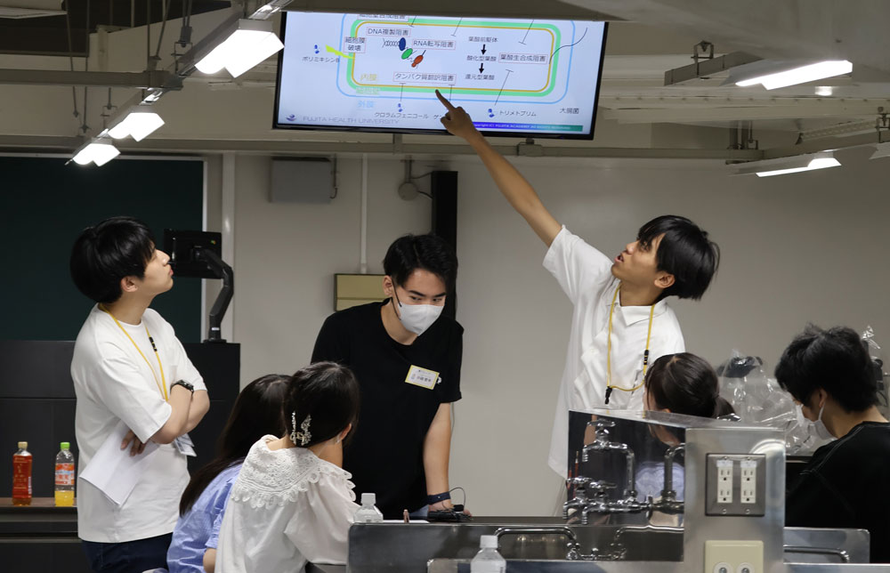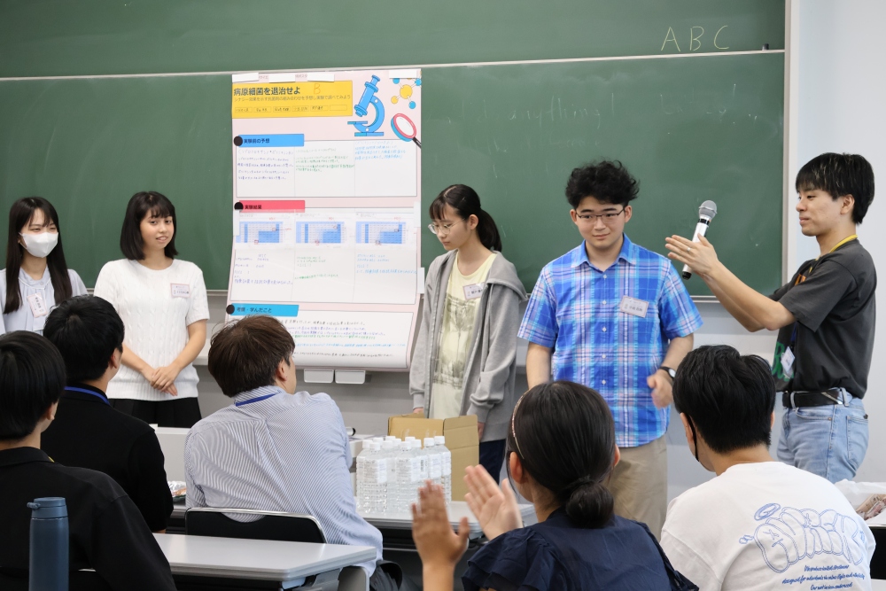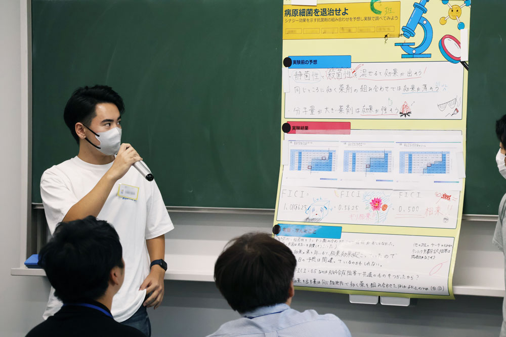 2日目には実験結果を解析し、グループごとに考察を発表。研究協力者として参加した本学医学部スチューデントリサーチャープログラムの学生さんたちの助言を受けながら、 研究者さながらに仮説の検証からディスカッションまでを体験しました。