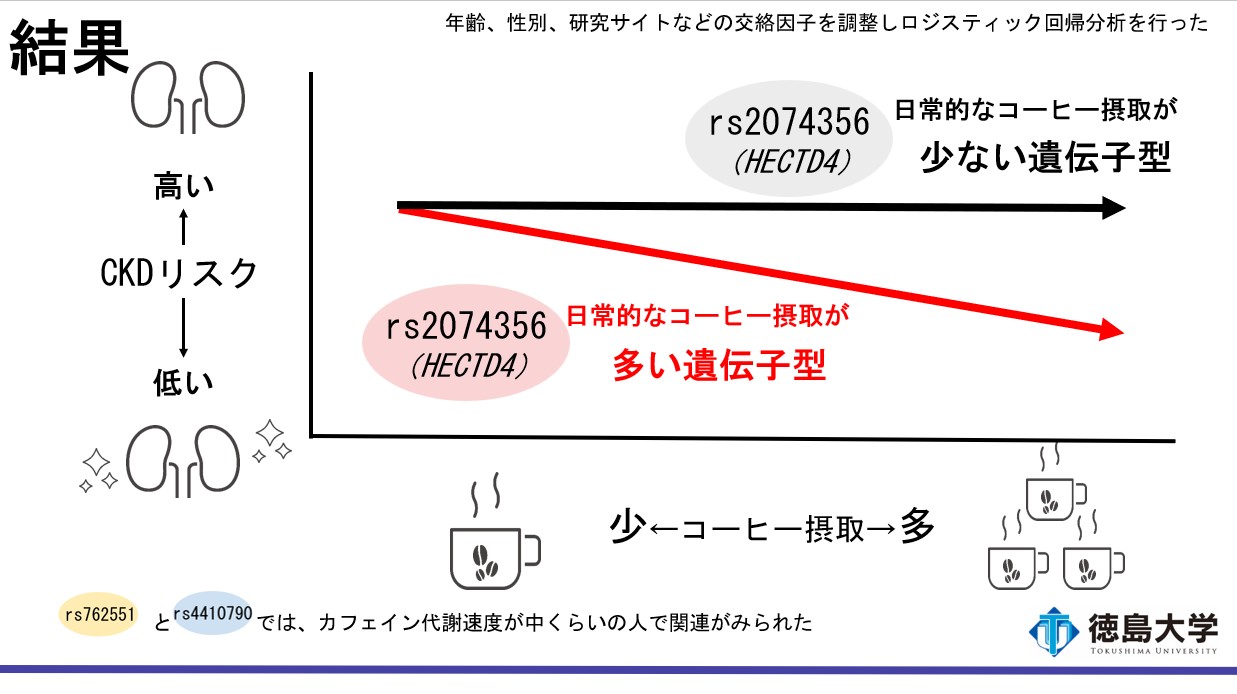 本研究の結果から、コーヒーと腎機能の関係には、コーヒー摂取行動やカフェイン代謝に関連する遺伝的多型が影響することが示唆されました。