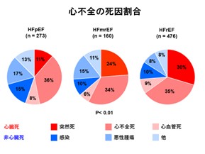 加えて最も特徴的であったのは、HFpEFで起こる突然死の半数以上が心室頻拍・心室細動ではなく、心停止(asystole)で発症していた点であり、HFrEFやHFmrEFとは全く異なる死亡プロファイルを示したことでした。