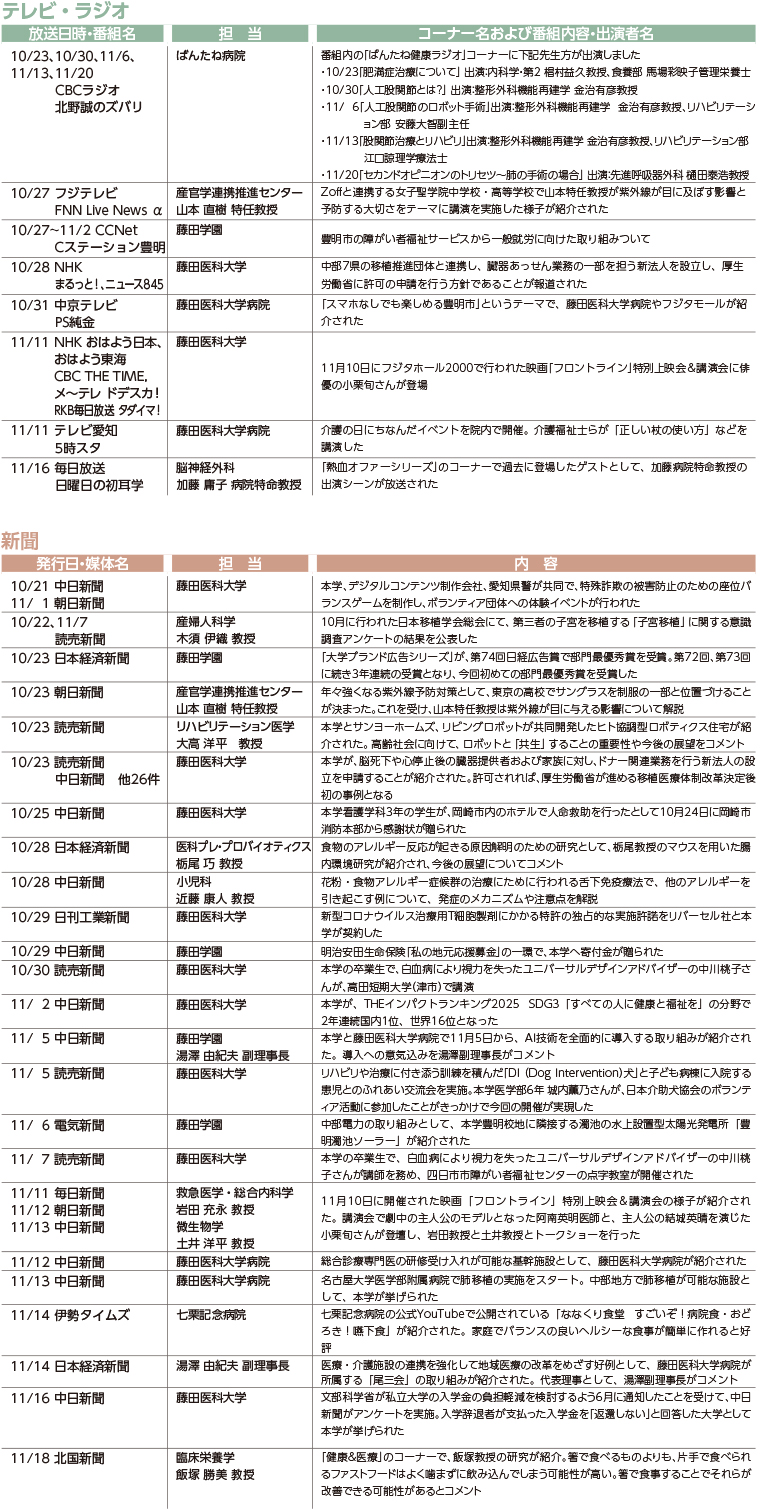本学園の取り組みや研究・医療ニュース等に関する記事の掲載、教職員のTV出演情報です。