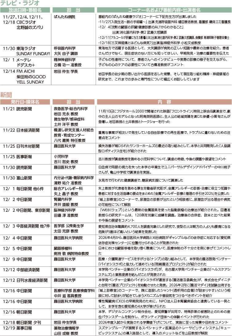 本学園の取り組みや研究・医療ニュース等に関する記事の掲載、教職員のTV出演情報です。