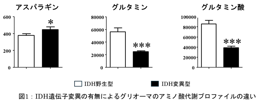 図1のように、IDH野生型グリオーマではアスパラギン濃度が、IDH変異型グリオーマではグルタミンおよびグルタミン酸濃度が、それぞれ有意に低下していることが明らかとなりました。