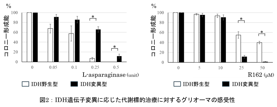 - IDH変異型グリオーマでは、グルタミン/グルタミン酸代謝系の枯渇に対して脆弱であることを示した