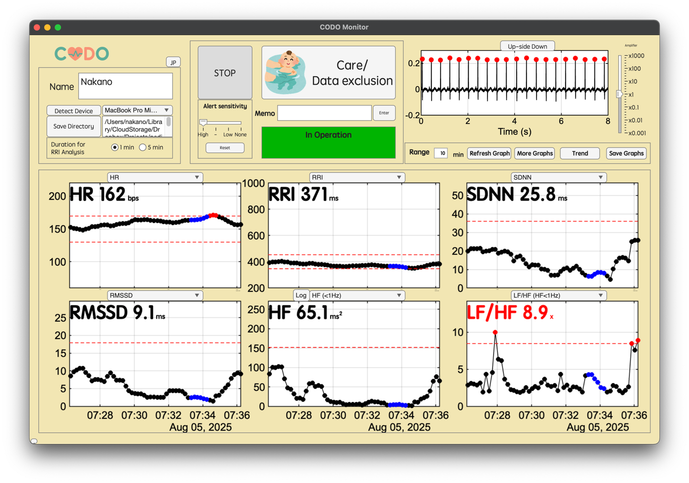 藤田医科大学医学部情報生命科学講座 中野 高志准教授、小児科学講座 藤野 正之講師、宮田 昌史教授、吉川 哲史教授らの研究グループは、リアルタイムで長時間心拍を解析し、病気につながる指標を可視化する新しい心電図解析ソフトウェア「CODO Monitor」を開発しました。このソフトウェアは様々な心電図指標の短時間変動と長期間トレンドを同時に可視化できるだけでなく、患者に合わせたアラート機能を搭載しています。