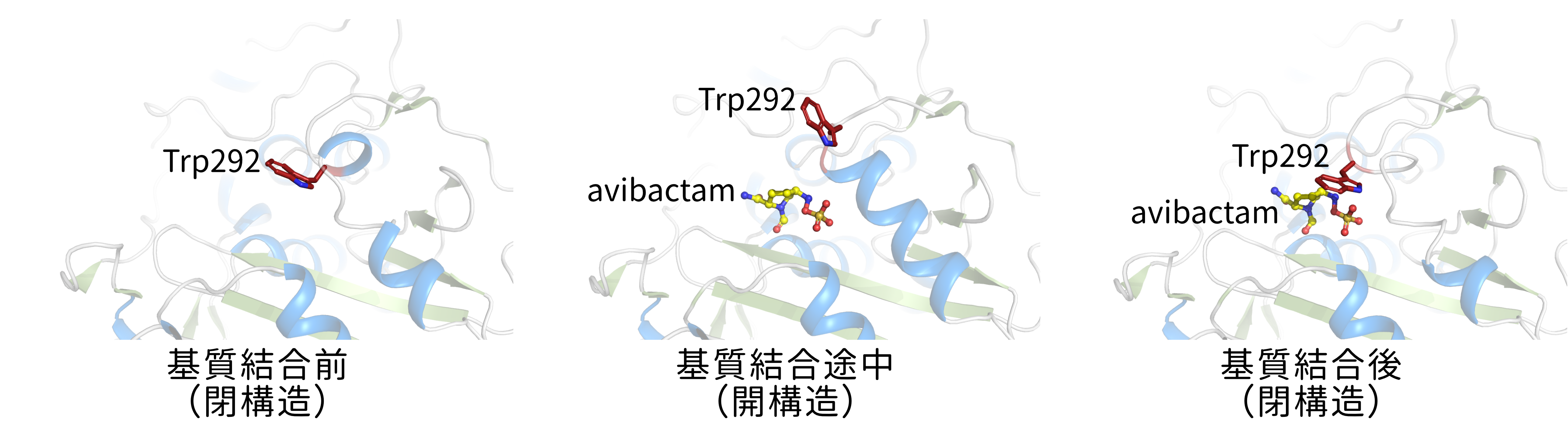 研究グループは、国際的な抗菌薬耐性臨床研究ネットワーク(Antibacterial Resistance Leadership Group: ARLG)内で実施されたカルバペネム耐性 Acinetobacter baumannii を対象とした研究プロジェクト(Study Network of Acinetobacter as a Carbapenem-Resistant Pathogen: SNAP)を通じて、428株の臨床分離株を取得しました。これらの菌株について、抗菌薬cefiderocolの感受性を指標にADCバリアントの比較解析を行いました。Cefiderocolは、多剤耐性グラム陰性菌感染症の治療に用いられるβ-ラクタム系抗菌薬であり、カルバペネム耐性菌に対しても高い活性を示す臨床的に非常に重要な薬剤です。ゲノム解析の結果、428株中に52種類のADCバリアントの存在が確認されました。さらに、cefiderocolに対して耐性傾向が観察されるグループには、ADC-33、ADC-225、およびADC-227の3つのバリアントを有する株が集約されていました。これらのバリアントはいずれもオメガループ218a位にアラニン挿入が観察されました。さらに、ADC-33では菌株間で耐性度に幅がみられましたが、アラニン挿入に加えて292位のバリンがグリシン(ADC-225)またはトリプトファン(ADC-227)に置換されたADC-225やADC-227では、菌株間で一貫して高い耐性傾向が認められました。292位のバリンは基質結合ポケットを構成する重要なアミノ酸です。この部位が構造の小さなグリシンに置換された場合、基質結合ポケットの拡張が生じる可能性が考えられます。一方、側鎖が大きいトリプトファンへの置換は、ポケットを狭める方向の変化をもたらすと予想されました。このようにADC-225とADC-227の292位のアミノ酸置換は、一見相反する方向への変化をもたらすことが予想される一方で、いずれの置換でも耐性が強化されていた点は特に注目すべき結果でした。そこで、基質認識がより不利となると考えられたトリプトファン置換型ADC-227に焦点を当て、より詳細な酵素学的解析および構造解析を行いました。その結果、ADC-227はcefiderocolの低感受性化に加え、同じく難治性グラム陰性菌感染症の治療薬であるceftazidime–avibactam合剤に対して更に高度な耐性を付与することが明らかになりました。さらに、ADC-227はcefiderocolやceftazidimeなどの高世代セファロスポリン系薬剤に対し、低濃度でも効率的に分解活性を示すことが耐性強化の主要因であることがわかりました。構造解析の結果、292位を含むR2ループは、基質認識時に大きく開き、基質結合後には変異トリプトファンが“蓋”のように基質を包み込む動的構造変化を示すことが明らかになりました(図1)。このダイナミックな構造変化が、ADC-227が低濃度下でも高い分解活性を可能にする分子基盤であると考えられます。