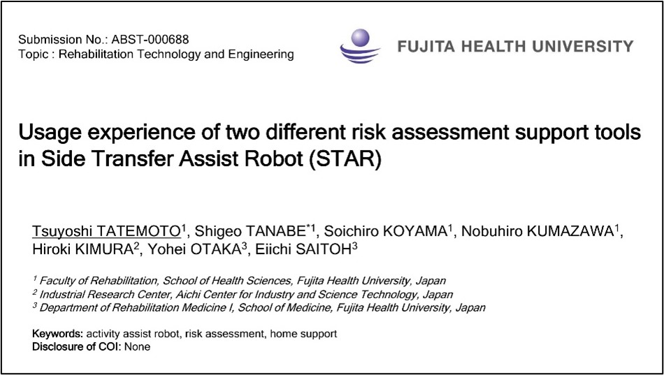 立本研究員が「Usage experience of two different risk assessment support tools in Side Transfer Assist Robot (STAR)〔横移乗支援ロボットSTARにおける2種のリスクアセスメントツールの使用経験〕」をテーマに発表しました.STARは,愛知県の事業である「知の拠点あいち重点研究プロジェクトⅢ期」の研究成果の一部であり,国際学会の場で成果を紹介しました.