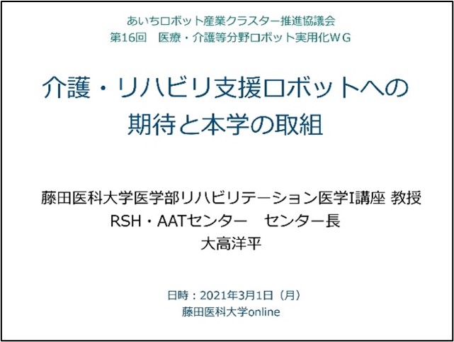 2021/3/1(月)に,あいちロボット産業クラスター推進協議会が主催する,第16回 医療・介護等分野ロボット実用化ワーキンググループが,オンラインで開催されました.