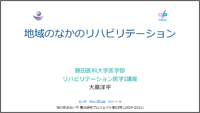 2021/11/18(木)に,豊田地域医療センターが主催する,地域リハイノベーションセンター(Community-Based Rehabilitation Innovation Center)開設記念公演(市民公開講座)がオンライン開催されました.