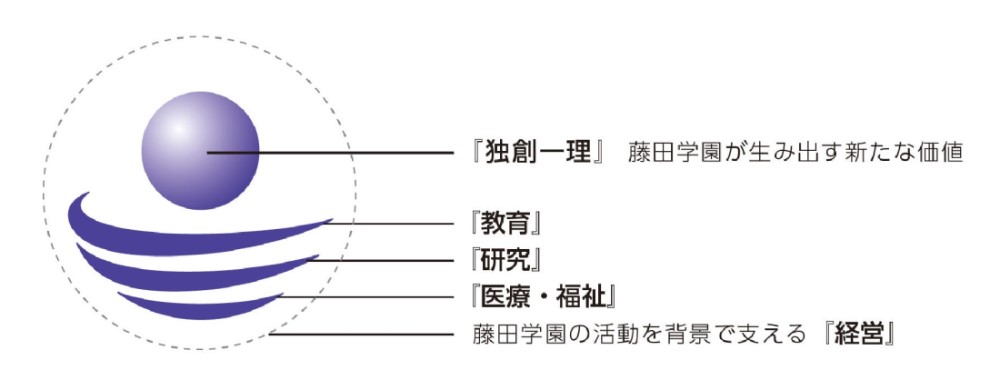 シンボルのデザイン作成に当たり、藤田学園の伝統的シンボルであったプロミネンスマークの「太陽・大気・水」の要素を継承し、現代的にシンプルに表現することをめざしました。シンボルに用いる基本的なカラー(色彩)には、「フジタ ウィスタリア」(藤色)を採用し、併記する文字列のデザインとして施設名ロゴタイプを定めました。