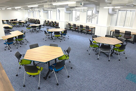 人数に応じて組み合わせられる多角形のテーブルが配置されたディスカッションスペース(左)や個別電源が配備された自習スペース(右)などがあります。