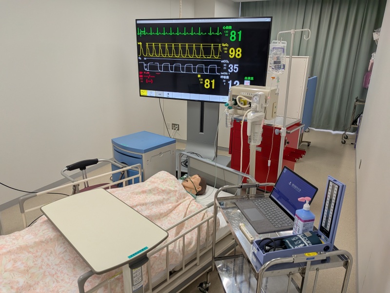 急性期看護などの実習前演習で使用します。病室環境を再現しており、入室時の対応から医療機器の配置、患者さんへの声かけまで、臨床を意識した対応力を磨きます。