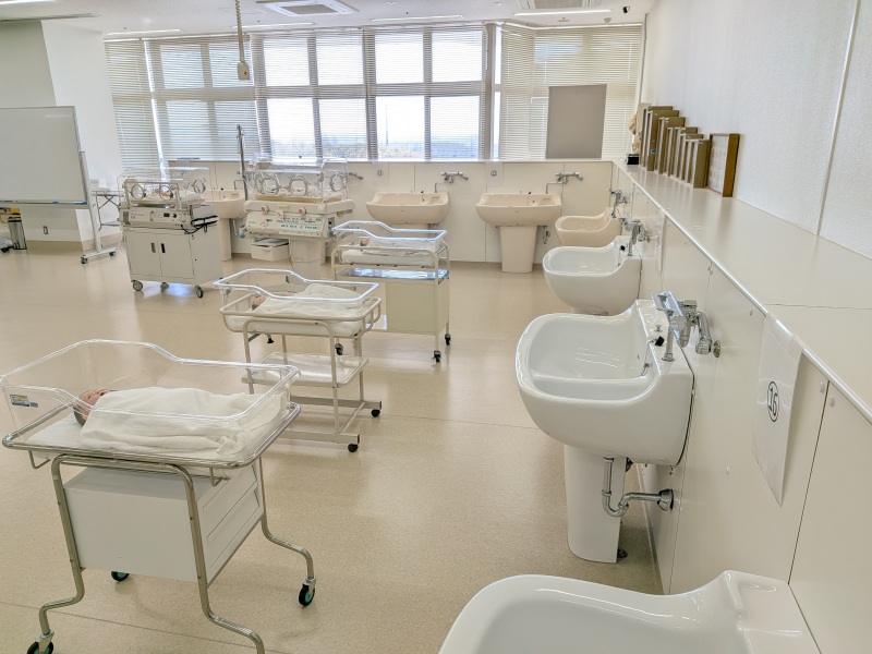 16台の沐浴槽・ベビーベッド・保育器・乳幼児モデルなどを備えた教室で、母性看護学と小児看護学の演習を行います。母性看護学では沐浴・オムツ交換・保健指導を、小児看護学ではバイタルサイン測定・点滴固定・経管栄養・保育器の取り扱いなど、子どもの成長発達と健康障害に応じた看護技術を学びます。