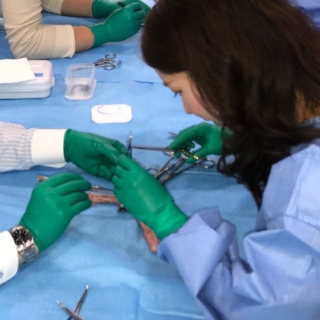 初回は、病院内や近隣施設を貸し切って、腹腔鏡のドライボックスを用いた縫合&糸結びの講習、また豚の腸管・肝臓を用いて縫合練習や腹腔鏡下胆嚢摘出術を行います。 (結紮縫合トレーニング)
